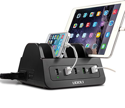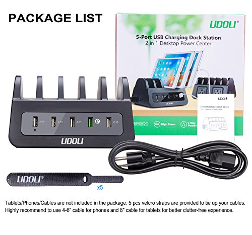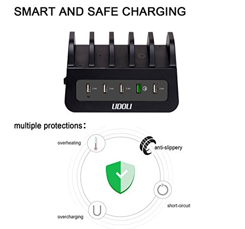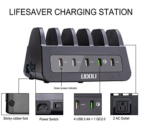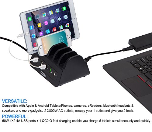 COMPACT CHARGING DOCK ALL IN ONE: AC adapter built in USB station plus 2 standard AC outlets, eliminate eyesore of outer power brick. 4x2.4A + 1 QC2.0 USB ports boost fast charging. Smart chipset prevent overcharging and overheating.