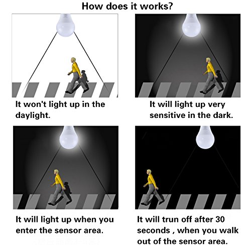 - Motion Sensor LED Bulb: The light will be turned on when the ambient light is low or dark and movement object goes into the effective area; And the light will be turned off after 30 seconds when the body leaves the effictive area or the body keeps motionless.