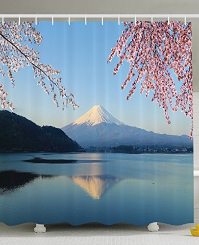 Spring Decor Shower Curtain by Ambesonne, Cherry Blossoms Sakura Snowy Mountain Fuji Lake View Picture Print, Polyester Fabric Bathroom Set with Hooks, 69 X 70 Inches, Blue Pink and White