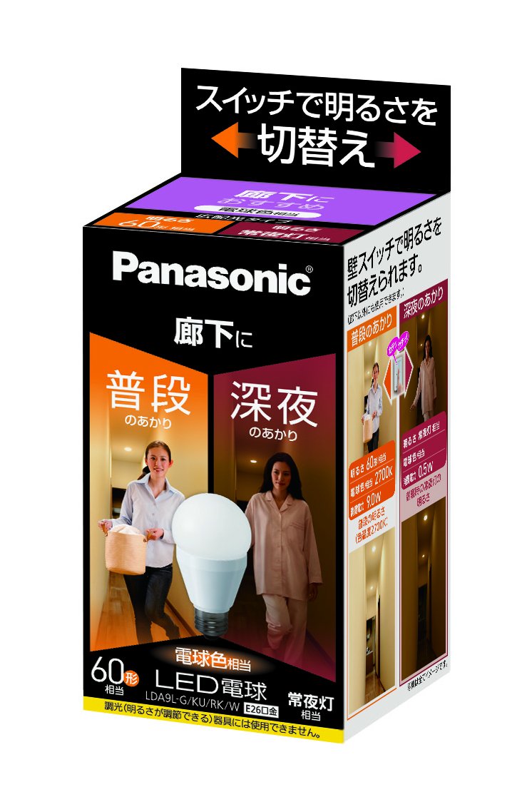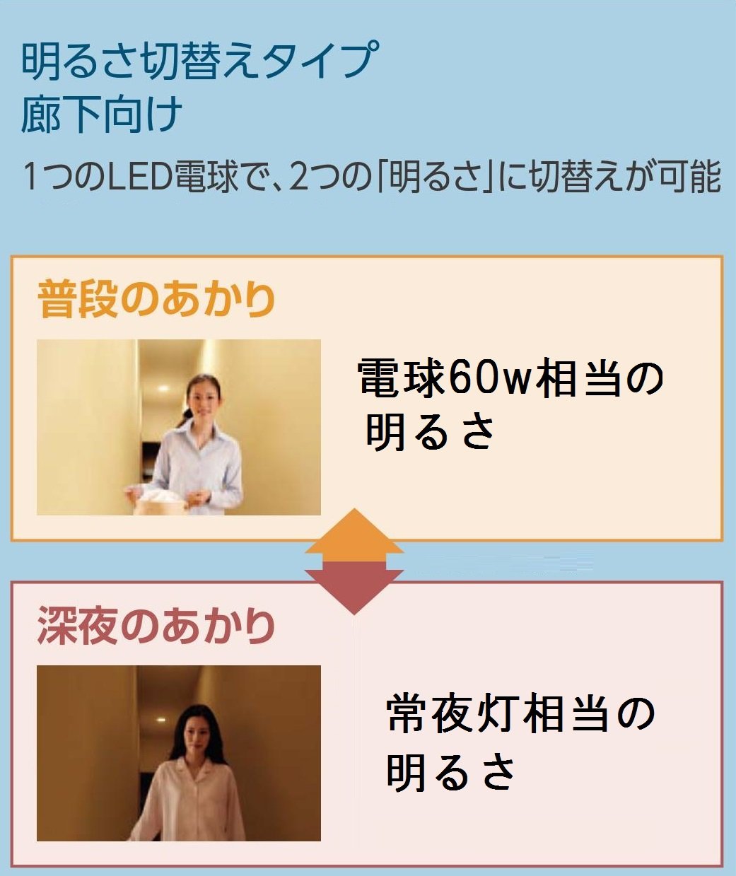 ◆ Provide a lighting adapting to the scene of the corridor Under normal conditions, lighting the corridor with "normal lighting" of brightness equivalent to light bulb 60 type (810 lumens), at bedtime it is equivalent to night light (20 lumens) "late night light
