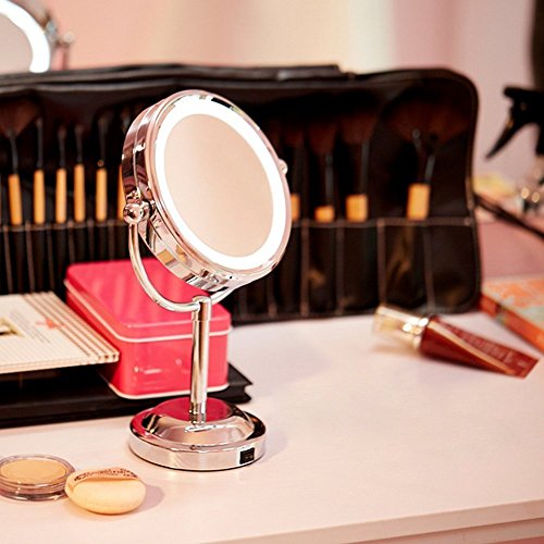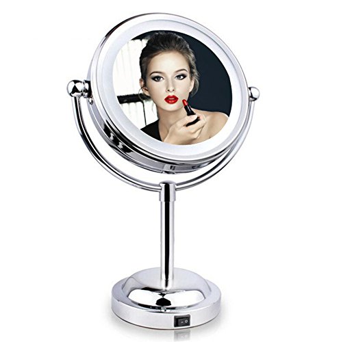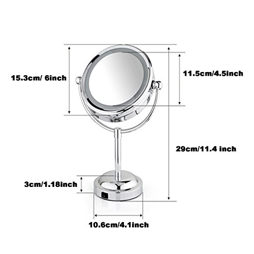 LED lighted Mirror: Allow you to do your make-up in the dark or poorly light areas. Also it could be a night light, bring you midnight convenience where you need it when you need it. Keep you safe at night. Mirror Size: Only 6-inch, space-saving so that you have more space for cosmetics. Operated by 3 AA batteries.