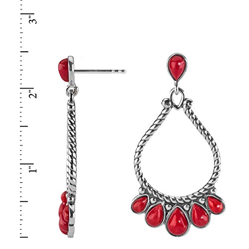 These earrings complement any skin tone and any color-- making them a great gift item for a best friend or yourself! A pear shape of sterling silver in a twisted rope design is accented with a burst of red coral teardrop color. Great with any Southwestern pieces, these earrings will be your go-to for Western fashion.