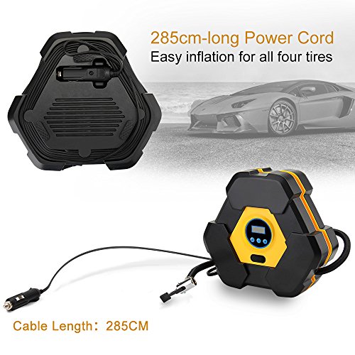 - EASY TO OPERATE : The type of cigarette socket can be inserted directly, 9.4ft power cord make it convenient to get the front and rear tire inflation. Automatically and rapidly inflated. One-touch switch (Just press start to start work, press close to stop) makes air compressor convenient to use