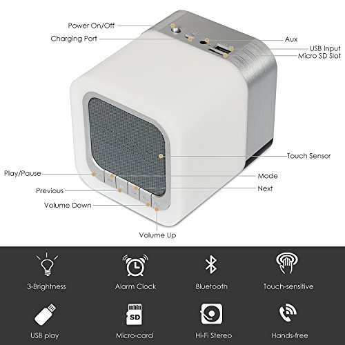 4.Highly Portable:It's 100*100*112mm dimenssion so very easy and convenient for carrying,suitable for party speaker ,travel, home, living room, bedroom.you can Create a files named "ALARM" and put your favorite song or alarm in. Then insert the TF card or U disk into the Bluetooth speaker. Automatically change the default alarm to your own alarm!