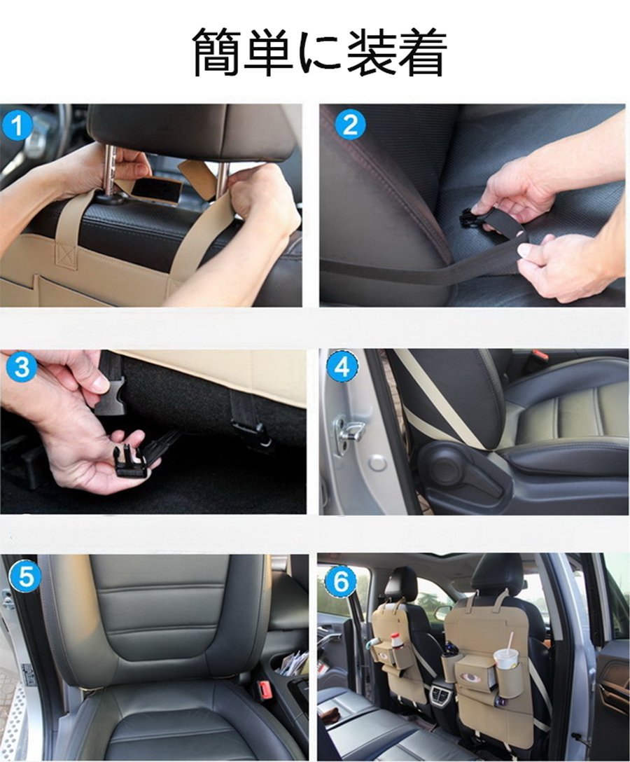 Easy installation by attaching the mounting belt to the headrest, seat and hook on the bottom side of the seat.