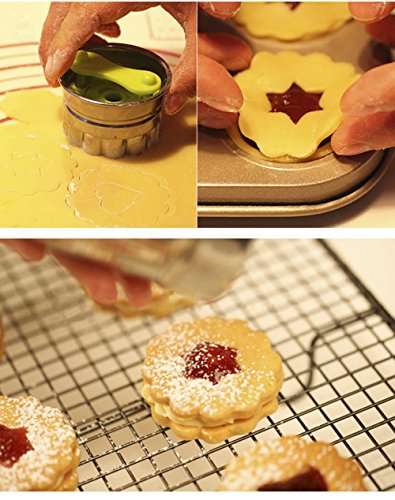 The durable stainless steel set features a large fluted cookie cutter with a convenient ABS plastic plunger that pushes dough out after it's cut.