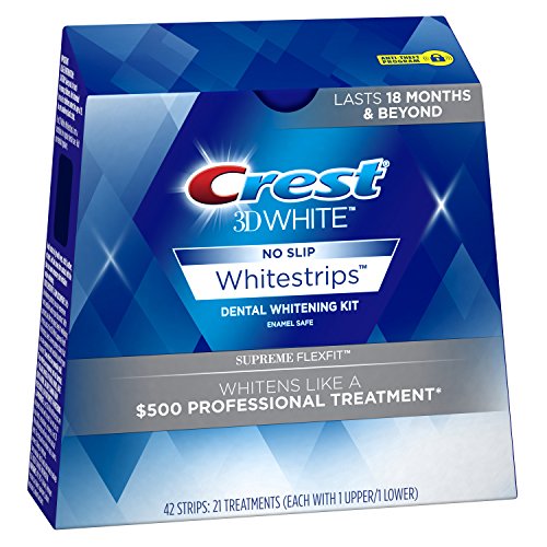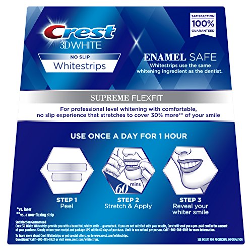 ReleaseDate : 2016-07-18 Studio : Procter Gamble - HABA Hub Publisher : Procter Gamble - HABA Hub Binding : Health and Beauty Product Description Unleash a brilliantly dimensional smile with Crest 3D White Supreme Flex Fit White strips. They whiten as well as a $500 professional laser treatment to give you a megawatt smile. These White strips bring the power of professional whitening to your home so you can get a brilliant smile quickly and easily. Our exclusive Flex Fit technology allows these strips to stretch, covering 30% more of your smile vs. a non-flexing strip. 0