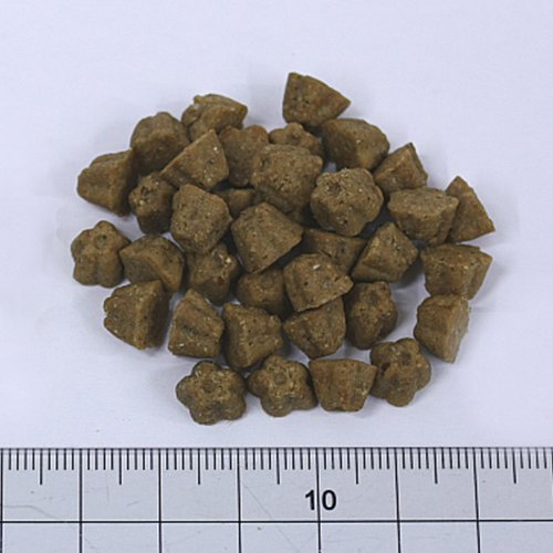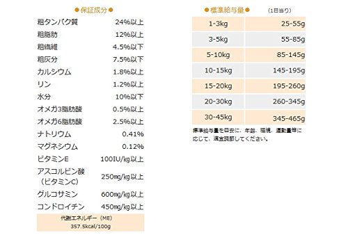 素材構成:粗タンパク質 24%以上、粗脂肪 12%以上、粗繊維 4.5%以下、粗灰分 7.5%以下、カルシウム 1.8%以上、リン 1.2%以上、水分 10%以下、オメガ3脂肪酸 0.5%以上、オメガ6脂肪酸 2.5%以上、ナトリウム 0.41%、マグネシウム 0.12%、ビタミンE 100IU/kg以上、アスコルビン酸 (ビタミンC) 250mg/kg以上、グルコサミン 600mg/kg以上、コンドロイチン 450mg/kg以上、代謝エネルギー(ME) 357.5kcal/100g