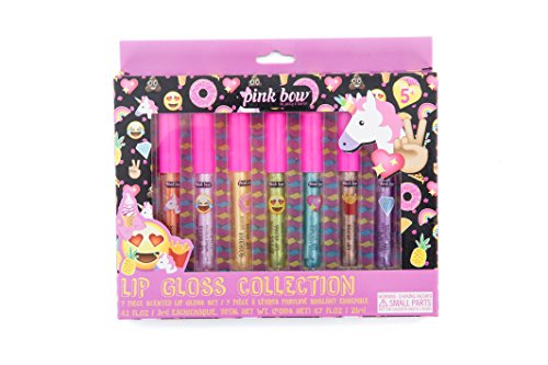 -. Feature : 7 super glossy, shimmer, flavored lip glosses. Orange, Strawberry, Banana, Apple, Cotton Candy, Chocolate, Grape flavors. Wand applicator. Safe for children ages 5 and up.