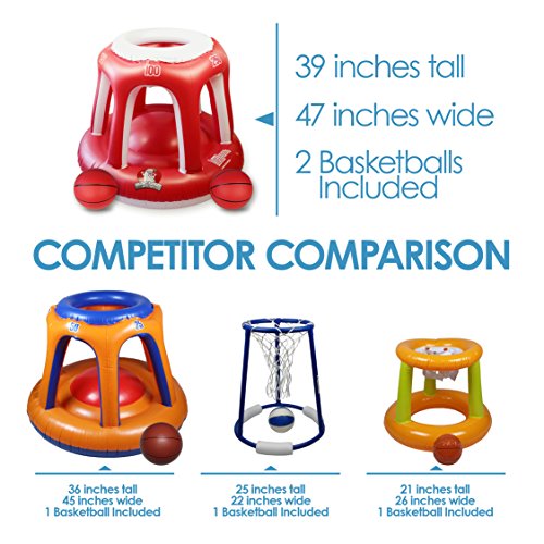 Enjoy hours of refreshing swimming pool game time with our Inflatable Basketball Hoop Game, complete with 2 basketballs for endless water sport enjoyment. Compare our basketball pool toy with the size of other pool toys - our large base and overall increased size will outperform the others.Feature