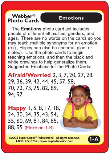 -. Binding : Toy -. Brand : Super Duper® Publications -. EAN : 9781586505103 -. Feature : 204 large photo cards (3" x 4") - 102 card pairs present children and adults showing a range of emotions (e.g., surprised, happy, worried) and facial expressions / 60 additional cards - 30 pairs of black and white facial drawings also depict feelings / Includes contents cards and four colorful handheld mirrors for practicing facial expressions / Educational - Helps children understand and identify feelings, and encourages personal discussion / You might also enjoy our "Photo Feelings" Fun Deck Cards - also featured on Amazon -. ISBN : 1586505106 -. Label : Super Duper® Publications -. Manufacturer : Super Duper® Publications -. MPN : WFC-264 -. PackageQuantity : 1 -. PartNumber : WFC-264 -. ProductGroup : Toy -. ProductTypeName : TOYS_AND_GAMES -. Publisher : Super Duper® Publications -. Studio : Super Duper® Publications -. Title : Webber Photo Cards "Emotions" - Super Duper Educational Learning Toy for Kids