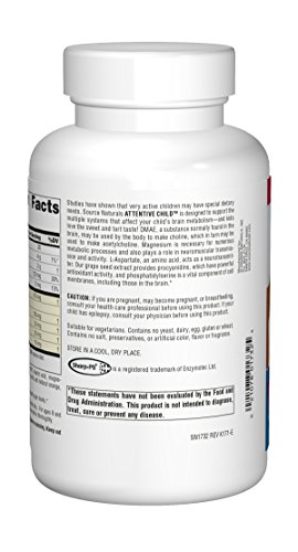 Dietary supplement. Attention. Excellence. Results. Bio align. Enhances mental concentration. Dietary supplement. Studies have shown that very active children may have special dietary needs. Source Naturals Attentive child is designed to support your child's ability to focus - and kids love the sweet and tart taste! DMAE, a substance normally found in the brain, has been shown to help enhance mental concentration. Magnesium also plays a role in neuromuscular transmission and activity L-Aspartate, an amino acid, acts as a neurotransmitter. Grape seed extract is rich in procyanidins, which have powerful antioxidant activity and phosphatidylserine is a vital component of cell membranes, including those in the brain. Contains no yeast, dairy, egg, gluten, or wheat. Contains no salt, preservatives, or artificial color, flavor or fragrance. (These statements have not been evaluated by the Food and Drug Administration. This product is not intended to diagnose, treat, cure or prevent any disease).Feature