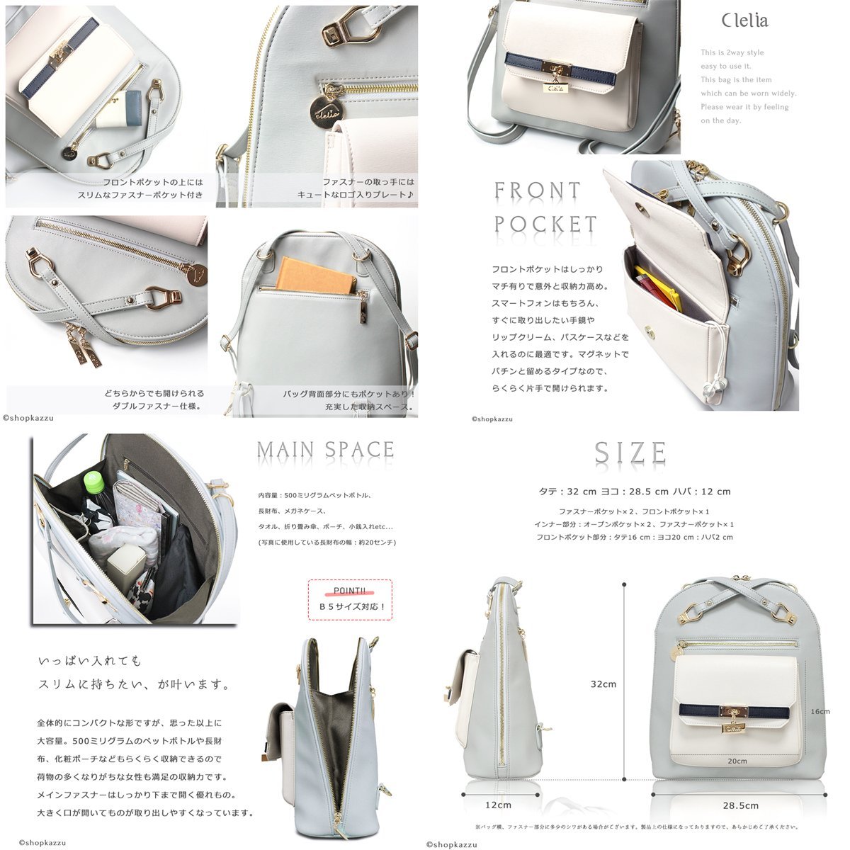 For front pockets, it is recommended to insert small items like smartphones, pass cases, lip cream etc. that you want to take out quickly.