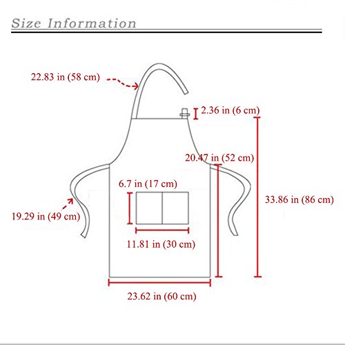 - ❤ Size -- Apron measures 23.6" wide by 33.9" long and features an adjustable neck strap to meet your comfort level. No more guessing at sizes -- this apron will comfortably fit up to 66" waist