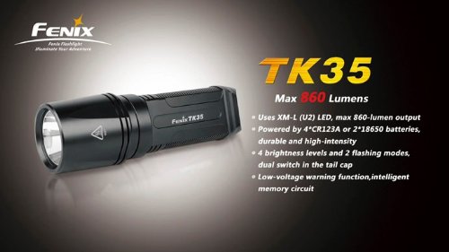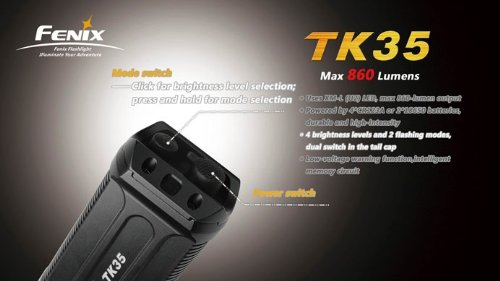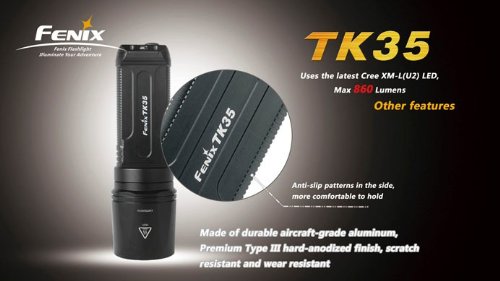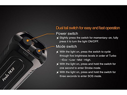 Studio : Fenix Flashlights Publisher : Fenix Flashlights Binding : Sports Product Description Fenix Tk35 is a convenient extremely high intensity multi-fuctional flashlight. Featuring in max 820 lumens output, offering four brightness levels, two different flashing functions and a signaling mode, powered by the frost resistant CR123A lithium batteries or high capacity 18650 rechargeable Li-ion batteries, it can definitely satisfy various lighting needs in different environments. The unique design of the batteries holder not only can compact the light but also make it comfortable to hold and convenient to use. With its dual button switch, you can transfer the brightness levels rapidly. It perfectly combines the outstanding performance and the great enjoyment of using it. TK35 must be the best choice for outdoor searching, caving, or using as a spare light for automobiles with Fenix advanced technologies.