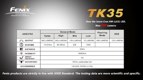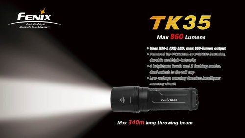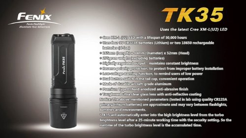 Amazon.com The ANSI certified TK35 is the latest handheld light designed by and in support of the professional industries. But this model is also designed to be compact and affordable enough to be carried by everyone. The model is the first to use the revolutionary Cree XM-L that is the most efficient LED on the market. This LED allows the TK35 to power itself up to 820 Lumens of brilliant white light in a unique flat bodied design that fits in the palm of your hand and can be worn or carried everyday. It is also equipped with a dual tail switches for easy operation. The first switch powers the light on and off while the second cycles the TK35 through it’s 6 modes that include four levels of brightness, SOS and emergency strobe. On turbo mode this remarkable waterproof handheld device will reach over 300 meters; and on low mode will last 170 hours before needing to replace batteries. TK35 Specifications: - LED: CREE XM-L (T6) LED