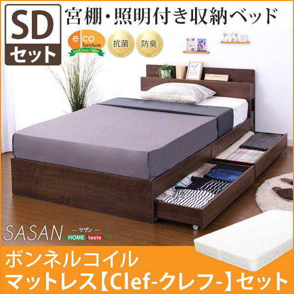 スマホ充電可能 宮、照明、チェストベッド【サザン-SASAN-(セミダブル)】(ボンネルコイルスプリングマットレス付き)