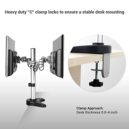 Weight Capacity: Supports up to 17.6 lbs (8 kgs) for each monitor; Tilt: -5 degrees to +15 degrees; Sw: 360 degrees (portrait or landscape); Swivel: Max 180 degrees; Maximum Height adjustable: 16.1-Inch (410 mm)