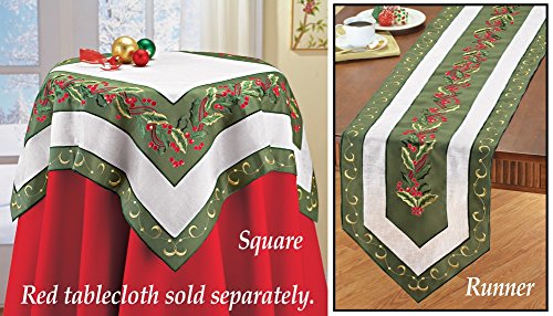-. Feature : Embroidered holly leaves and berries are surrounded by sheer white organza fabric with a scrolled gold embroidered border at the edge / Machine washable / Made from polyester / Available either as a Runner (69" x 13"), or a Square (34"Sq.) / Shop with confidence! For over 50 years, Collections Etc has been bringing unique, whimsical, inspirational, and home solution products to customers. All Collections Etc products come with a 60 day, easy return policy and 100% satisfaction guarantee