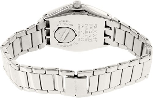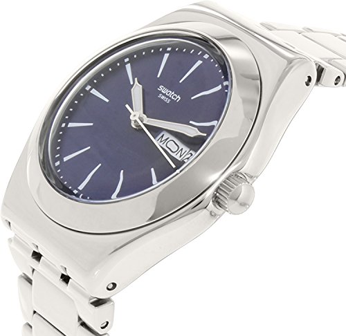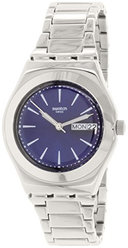 Stainless steel case with a stainless steel bracelet. Fixed stainless steel bezel. Blue dial with silver-tone hands and index hour markers. Minute markers around the outer rim. Dial Type: Analog. Luminescent hands and markers. Day of the week and date display at the 3 o'clock position. Quartz movement. Scratch resistant mineral crystal. Pull / push crown. Solid case back. Case diameter: 33 mm. Case thickness: 10 mm. Round case shape. Band width: 15 mm. Band length: 7.5 inches. Jewelry clasp. Water resistant at 30 meters / 100 feet. Functions: date, day, hour, minute, second. Casual watch style. Swatch Irony Blue Dial Stainless Steel Ladies Watch YLS713G.Feature