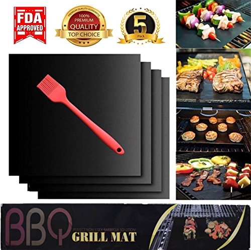 GLADO -Set of 5- 100% Non-stick BBQ Grill & Baking Mats & Silicon Brush(Red) - FDA-Approved, PFOA Free, Reusable and Easy to Clean - Works on Gas, Charcoal, Electric Grill and More - 13" X 16"