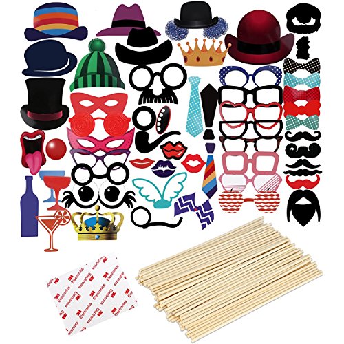 Quick and easy to assemble; simply attach the included bamboo dowels to each card stock prop image using the provided clear stickers. Then hold the prop in front of your face, over your head, etc.