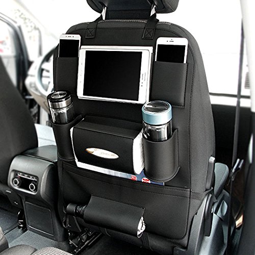 CiaraQ Water-Repellent Leather Car Seat Back Organizer and iPad mini Holder, Universal Use as Car Backseat Organizer for Kids, Kick Mat & Seat Back Protector, Great Travel Accessory for Kids.