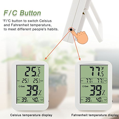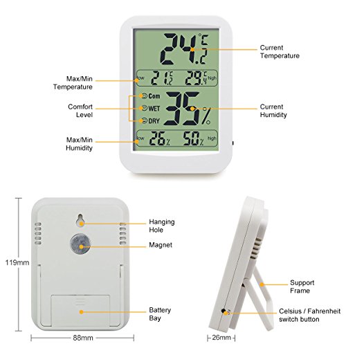 (1) If the digital numbers are fuzzy,it means low battery and the battery need to be replaced. (2) If the battery is reset, the maximum/minimum temperature and humidity are also cleared. (3) Please don't drop or thump our products. Package including :