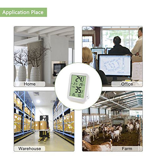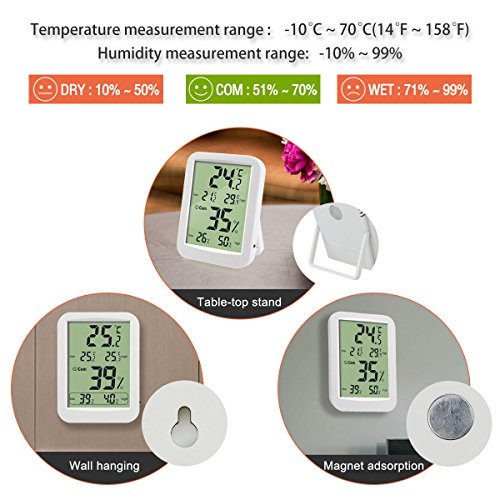 Product size: 3.7x 4.76 x 0.87 inches Product weight: 114g Temperature Detection Range: -10℃~70℃(14℉ ~ 122℉ Humidity Detection Range: 10%~99% Error Range: ±1℃,±5%RH Accuracy Range: 0.1℃,1%RH Battery: 1.5V(AAA)×1 Notes: