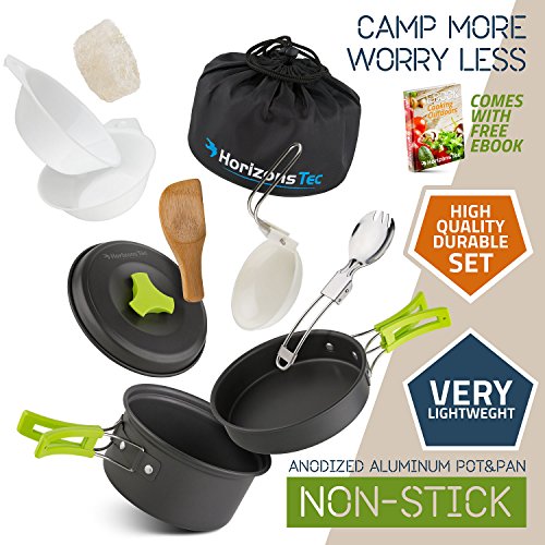 - ALL YOU NEED KIT: Our kit includes a pot and cover, a pan, a stainless steel spork, two bowls and a soup spoon, a wooden spatula, a loofah sponge and a carrying bag!