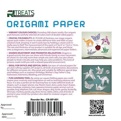 -. Binding : Office Product -. Brand : RL Treats -. EAN : 0705911706415 -. Feature : VIBRANT COLOR CHOICES: Providing 500 sheets totally. Our orgami pack features carefully selected 20 colors of double dided papers. / CRUCIAL FOLDABILITY: At 70 GSM of thickness, our mega orgami square pack makes it easier to create definitive lines and folds so your creations look amazing. / SHARED ENJOYMENT AND PROMOTES RELAXATION: orgami is a good activity taht you can share with friends family or even classmates at school / IDEAL FOR OFFICE AND SPECIAL DAYS: Get tons of colored papers for art and crafting supplies DIY projects all kinds of presentation for different occasions / FUN LEARNING TOOL: By using our square folding paper you could inspire your creativity and imagination as well as teaching patience and focus -. Label : RL Treats -. Manufacturer : RL Treats -. MPN : rl500 -. PackageQuantity : 1 -. PartNumber : rl500 -. ProductGroup : Art and Craft Supply -. ProductTypeName : ART_SUPPLIES -. Publisher : RL Treats -. Studio : RL Treats -. Title : 20 Vivid Colors 500 Sheets Double Sided Origami Paper 6-Inch by 6-Inch for Arts and Crafts Projects -. UPC : 705911706415