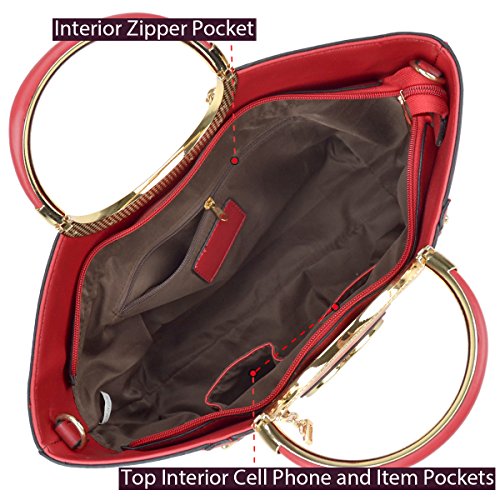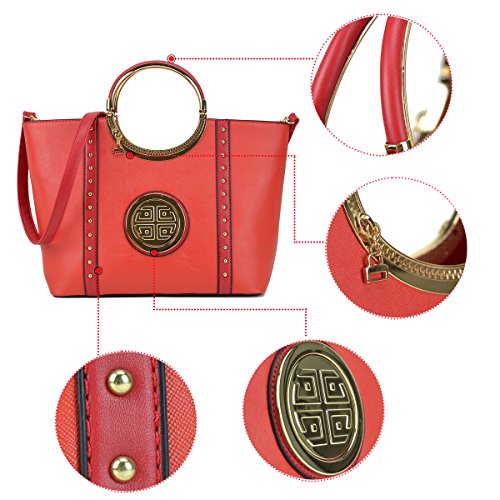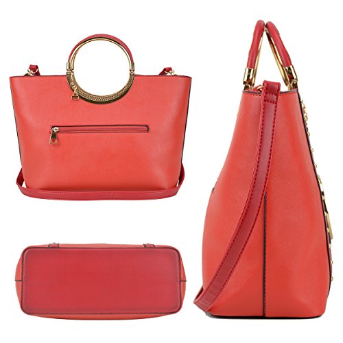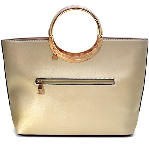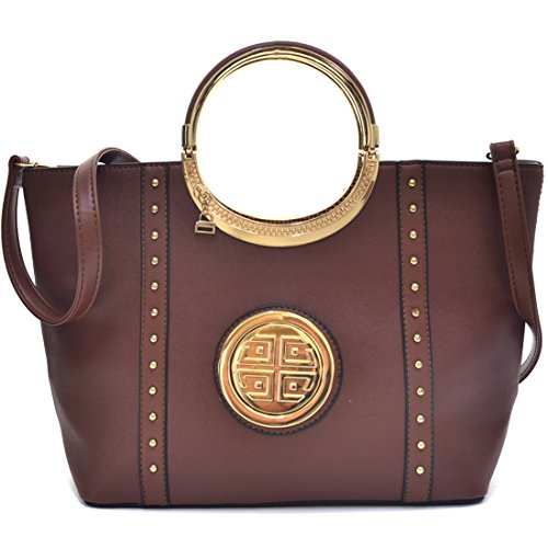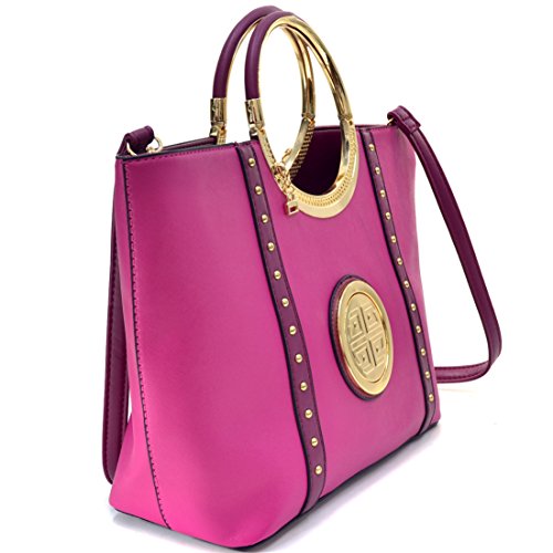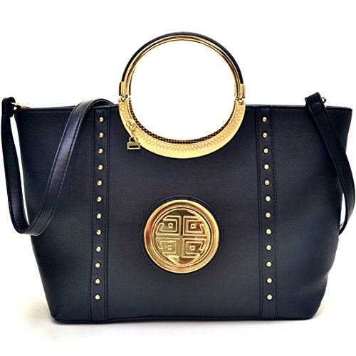 -. Brand : Dasein -. Department : womens -. Feature : Beautiful saffiano vegan faux leather. Goldtone hardware/Metal emblem and petite studs design / Rear zip pockets are great for keys or cell phone / Zip top closure opens wide for easy access with interior zipper and open top item pockets to stay organized / Shoulder Strap easily comes off and it converts to a tote bag. Dual top ring handles with faux leather and decorative zipper for comfortable carry in style / This structured satchel handbag measures 15.5"W x 10"H x 5"D with 5" handle drop and 45" houlder strap length. Dust bag included -. ProductGroup : Shoes -. ProductTypeName : HANDBAG -. Title : Top Handle Shoulder Bag Fashion Studded Satchel Handbag w/ Zip Accent