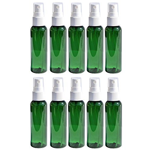 Travel Spray Bottles 2oz. Green PET Plastic Sets with White Fine Misting Sprayers For Essential Oils, Aromatherapy, Perfumes, Bug Repellant, Liquids (10)