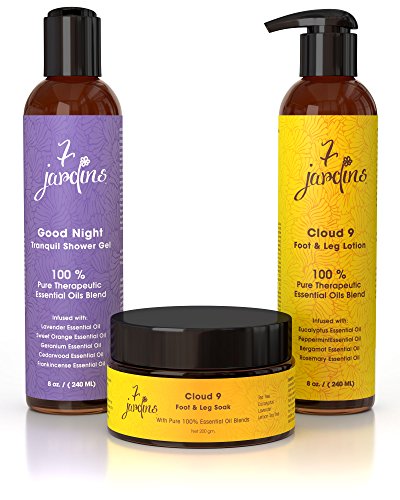 7 Jardins 100% Natural Aromatherapy Trio Gift Foot And Legs Soothing Spa Set. Put your feet up and let them float to cloud 9 of happiness. Foot Soak Salt, Foot Leg Relaxing Lotion & Relaxing Shower Gel with 100% pure soothing & relaxing essential oils, all natural no chemicals, paraben free, sulfate free, silicone free, cruelty free, no petroleum, no formaldehyde added, no synthetic fragrances, no perfum and artificial colors. Gluten free and wheat free. Only plant oils used. It will purify and
