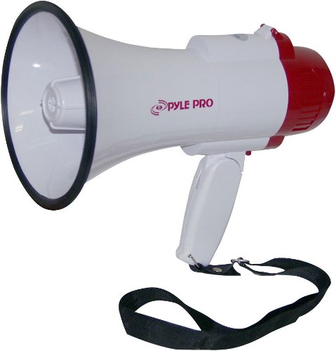 Studio : PYLE Publisher : PYLE Binding : Misc. Product Description This hand-held voice amplification device is the perfect accessory for those looking to get immediate crowd attention or involvement, no matter the application. This compact, yet powerful portable megaphone will provide 30 watts of output power, allowing the operator's voice to be projected a distance of up to 800 yards away. This durable, hand-grip style bullhorn is commonly used by the U.S. Army, Navy, Air Force and Marines due to its versatile size and weight, weighing just more than one pound with a diameter of only 6.25" by 10" in length. It requires four "D" sized batteries (not included) and comes equipped with a built-in siren function. Additional features include volume control, power on/off switch with LED indicator, siren and music control and a convenient carry strap.