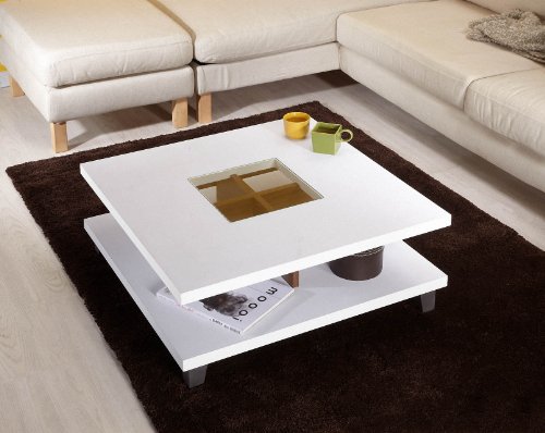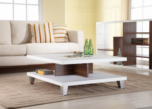 - Feature : Modern dual level square shaped coffee table with a matte white finished body / Product is made of medium fiber board construction; Four (4) silver finished legs / Bottom display area all around; Matte walnut X-shaped center support; center glass top insert / Assembly required by two adults; To clean, use damp cotton cloth to wipe clean; Made in Taiwan / Measures 31.5 inches wide by 31.5 inches deep by 13.2 inches high; 30-days hassle-free replacement parts warranty