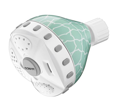 -. Feature : The Conair Home 4 Setting Shower Head in fun print adds style to any bathroom / Full body setting - wide cone spray for maximum coverage / Jet Massage setting - oscillating massage provides temporary relief to tired, sore muscles / Heavy Rain setting - full spray offers "pouring rain" sensation / Mist setting - full coverage mist gently hydrates skin
