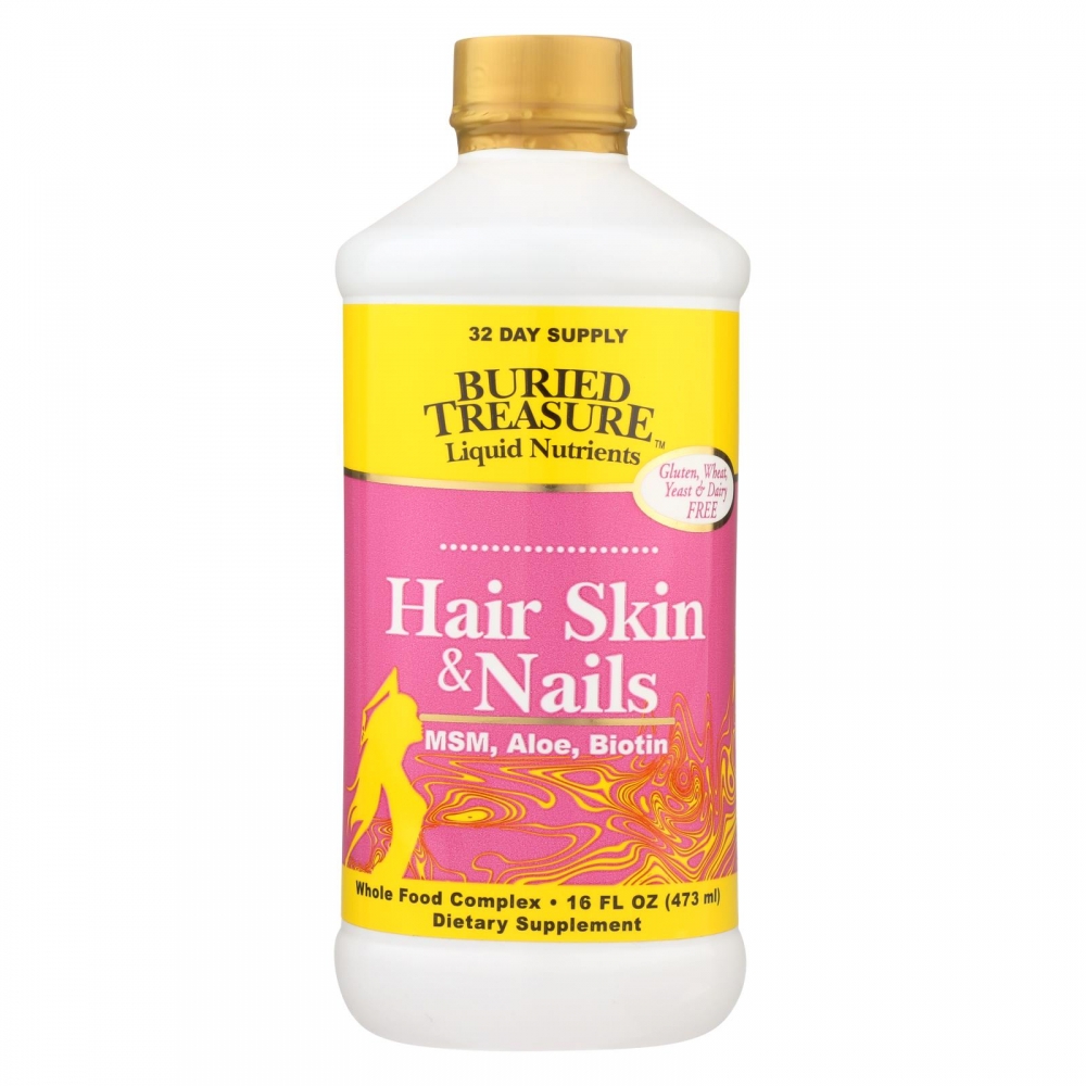 | Buried Treasure Hair Skin and Nails Complete Description: Beauty From Within Readily Absorbable MSM, Aloe, Biotin, Vitamins and Minerals Optimal health of skin, hair and nails is dependent upon adequate daily intake of key nutrients that supply the assurance of radiant health. Glowing skin, shiny hair, and strong nails begin with comprehensive nutrition provided by Buried Treasures Hair, Skin and Nails Complete.