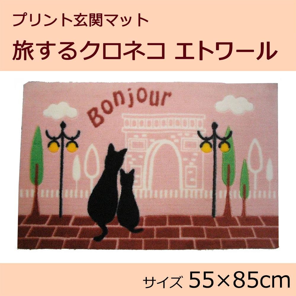| 旅する2匹のクロネコがプリントされたインテリアマット。アクリル糸を使用しているため、発色が鮮やかです。裏面にノンスリップ加工を施しており、滑りくく安心です。 |