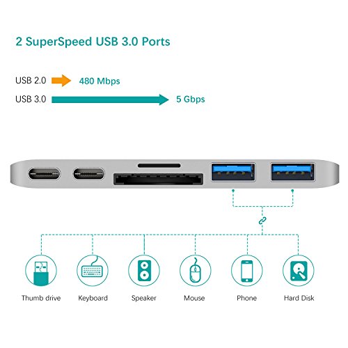 Expand to multiple ports Plug & Play with 1 x Super Speed @40Gbps usb 3.1 type c charging port&transfer data, 1 x usb 3.1 type c port(transfer data), 2 x USB 3.0 Ports, 1 x SD Memory Card Reader & 1 x microSD Memory Card.