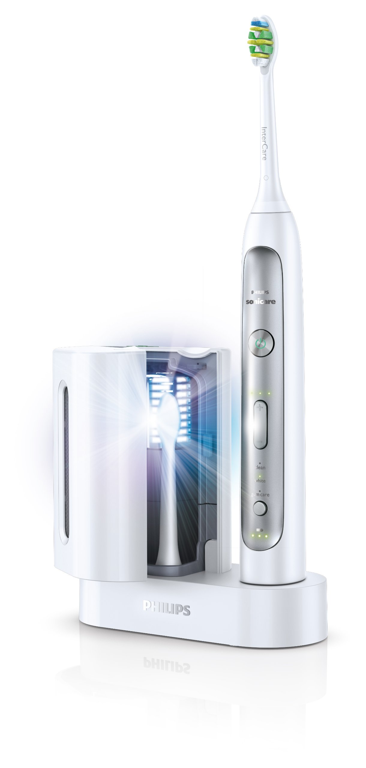 A newly developed intercare brush head scrapes the dental plaque between the teeth.