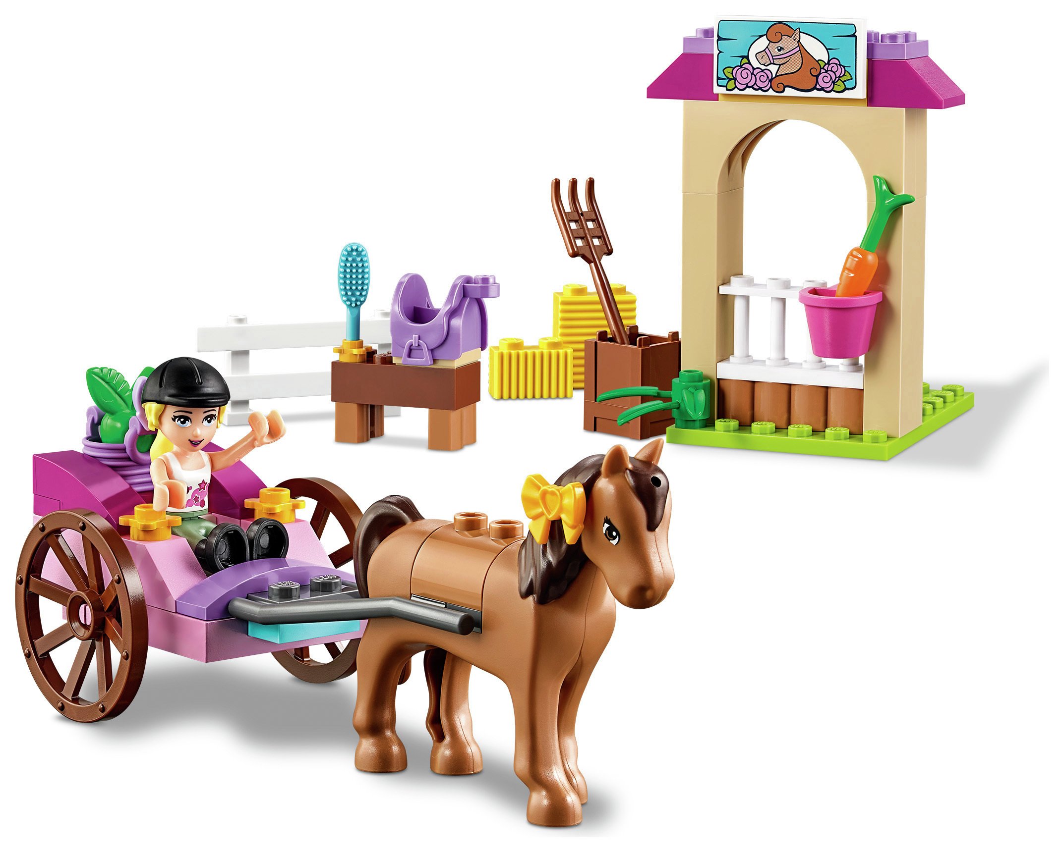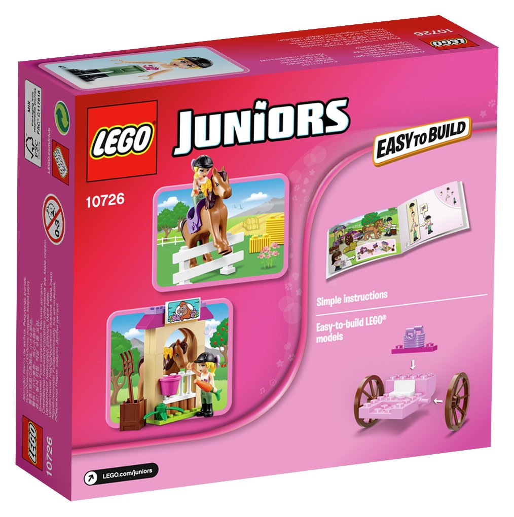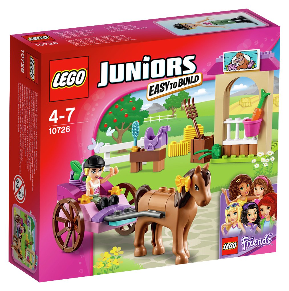 Go on a carriage ride with Stephanie and her horse. This colorful set features a carriage with rolling wheels and space in the back for a basket with green apple, a stable with fence, feed basket and carrot, a stand with grooming brush and saddle, a crate with pitchfork, and bows. LEGO® Juniors sets are age-appropriate building experiences for ages 4-7, with fun and recognizable LEGO Friends sets that give children a great start with the LEGO brick. Includes a mini-doll plus a horse.