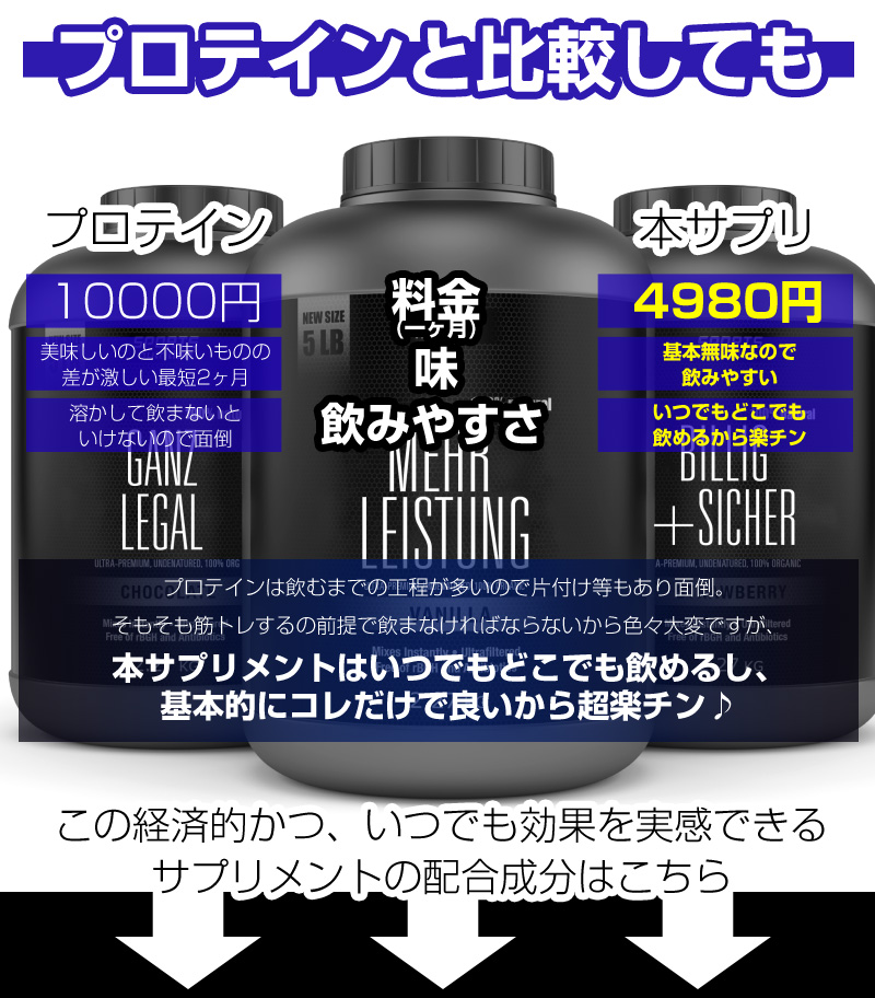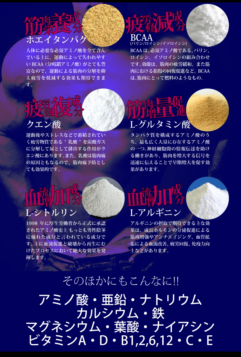 | 原材料名 | L-シトルリン、乳清たんぱく質(乳成分を含む)、食用酵母(亜鉛含有)、クレアチン/セルロース、ステアリン酸カルシウム、微粒酸化ケイ素、L-アルギニン、L-ロイシン、L-イソロイシン、L-バリン、L-グルタミン酸、クエン酸、貝殻焼成カルシウム、ヘム鉄(豚由来)、酸化マグネシウム、ビタミンC、ナイアシン、ビタミンE、パントテン酸、ビタミンB2、ビタミンB1、ビタミンB6、ビタミンA、葉酸、ビタミンD、ビタミンB12 |