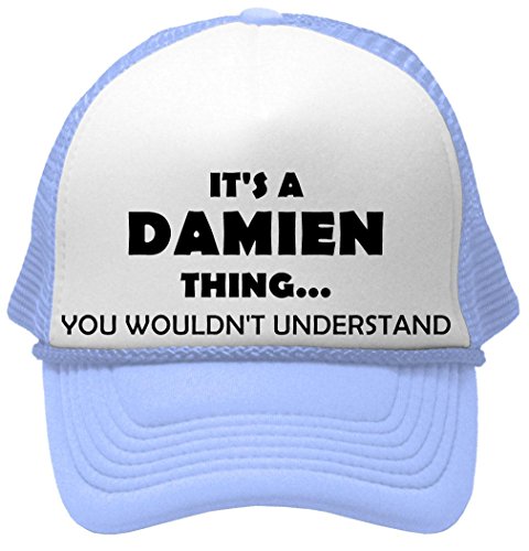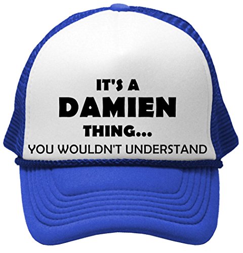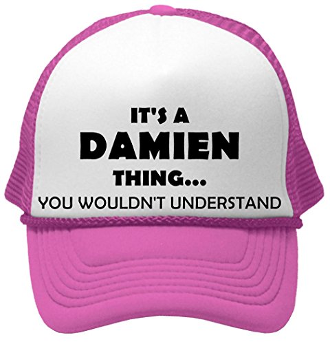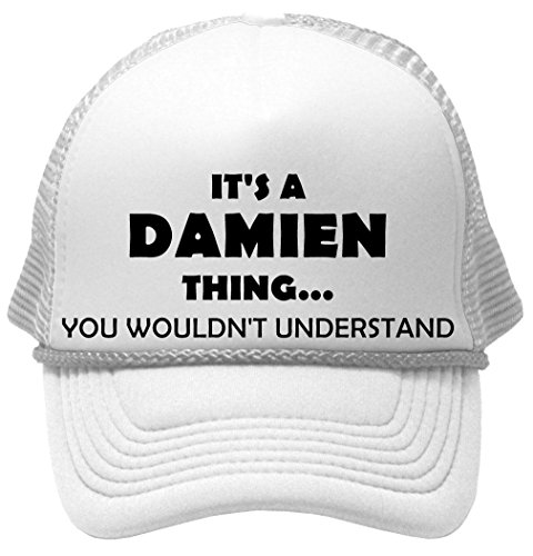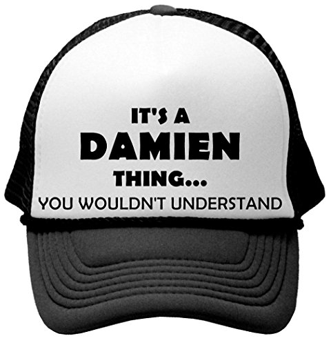 Product Description IT'S A DAMIEN THING... YOU WOULDN'T UNDERSTAND - 100% Polyester caps with a foam front and soft mesh sides and back. These hats feature a 3.5 inch crown and a 5 panel construction. The fastener is a double plastic tab design and the hat has a heavy braid across the brow. 0