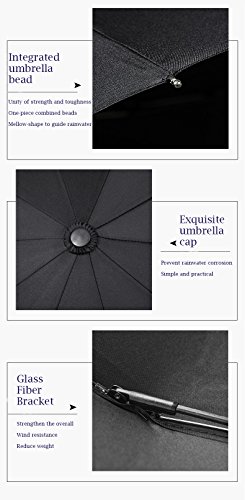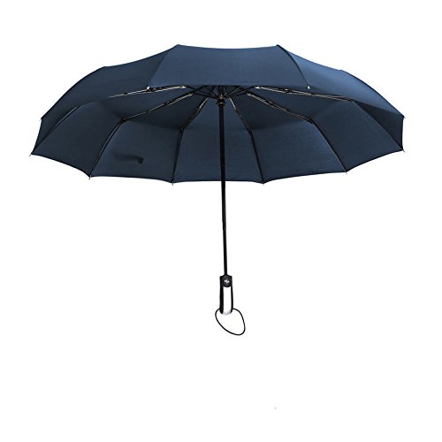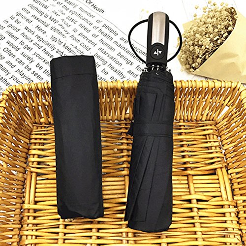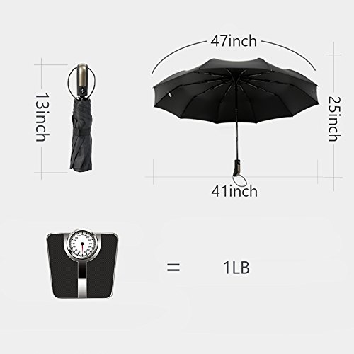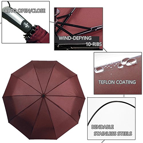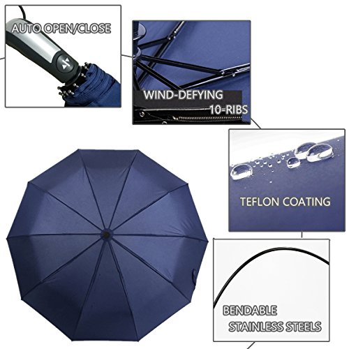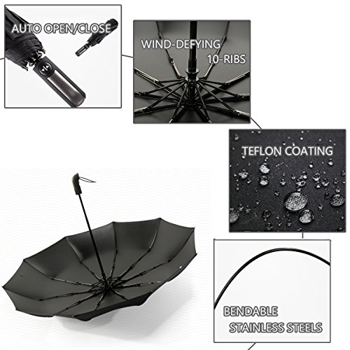 -. Feature : AUTO OPEN AND CLOSE: One Second One Hand Operation. Just push the button once to automatically open and press the same button again to instantly fold the canopy. Very handy when holding a coffee or a phone. / DURABLE & WINDPROOF: Sturdy and resilient 10 Ribs construction, stronger than the most 8 or 9 ribs umbrellas. Made of premium fiberglass and high quality black stainless steel which is strong and resilient to allow for greater stability in high winds. / WATER-REPELLENCY: Every umbrella canopy is made of 210T micro-weave Pongee fabric coated with the industry-leading Teflon fabric which can repel water and dry fast by shaking it. / COMFORTABLE AND PORTABLE: The Rubber Steel Mix Handle is slip-resistant designed and stylish. Provide a comfortable firm grip in any rainy weather. The folded size (12" length) and the lightweight (1lb) fits perfect in the glove compartment of cars, laptop bags, business briefcases or vacation luggage. / LIFETIME GUARANTEE: A protective travel sleeve is included. If you are not satisfied with our umbrella, just contact us, we will replace it or refund your total purchase with no additional cost!