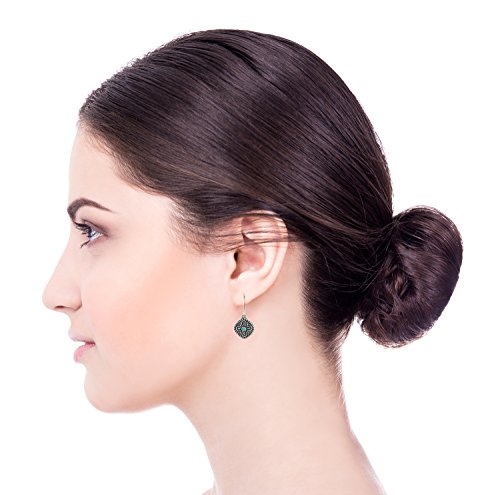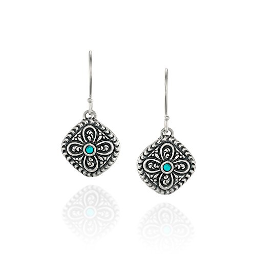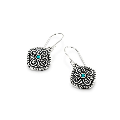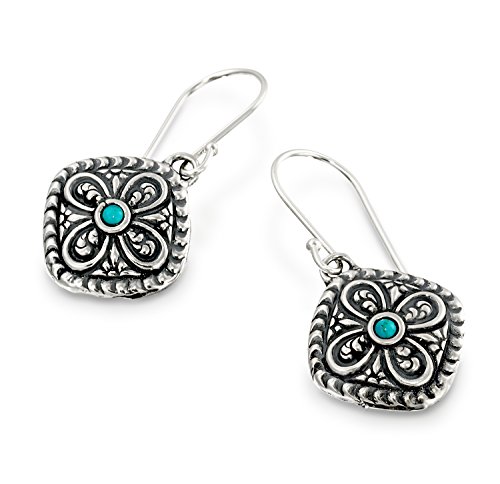 Antique style Turquoise Sterling Silver diamond-shaped dangle earrings with decorative floral design. 925 Sterling Silver dangle earrings with 2 mm round cabochon reconstituted Turquoise gemstone. These elegant earrings measure about 5/8" or 1.6 cm in size excluding the nickel free Sterling Silver French wire hooks. These earrings are lightweight and the Silver diamond-shape is open in the back. Unique artisan design.