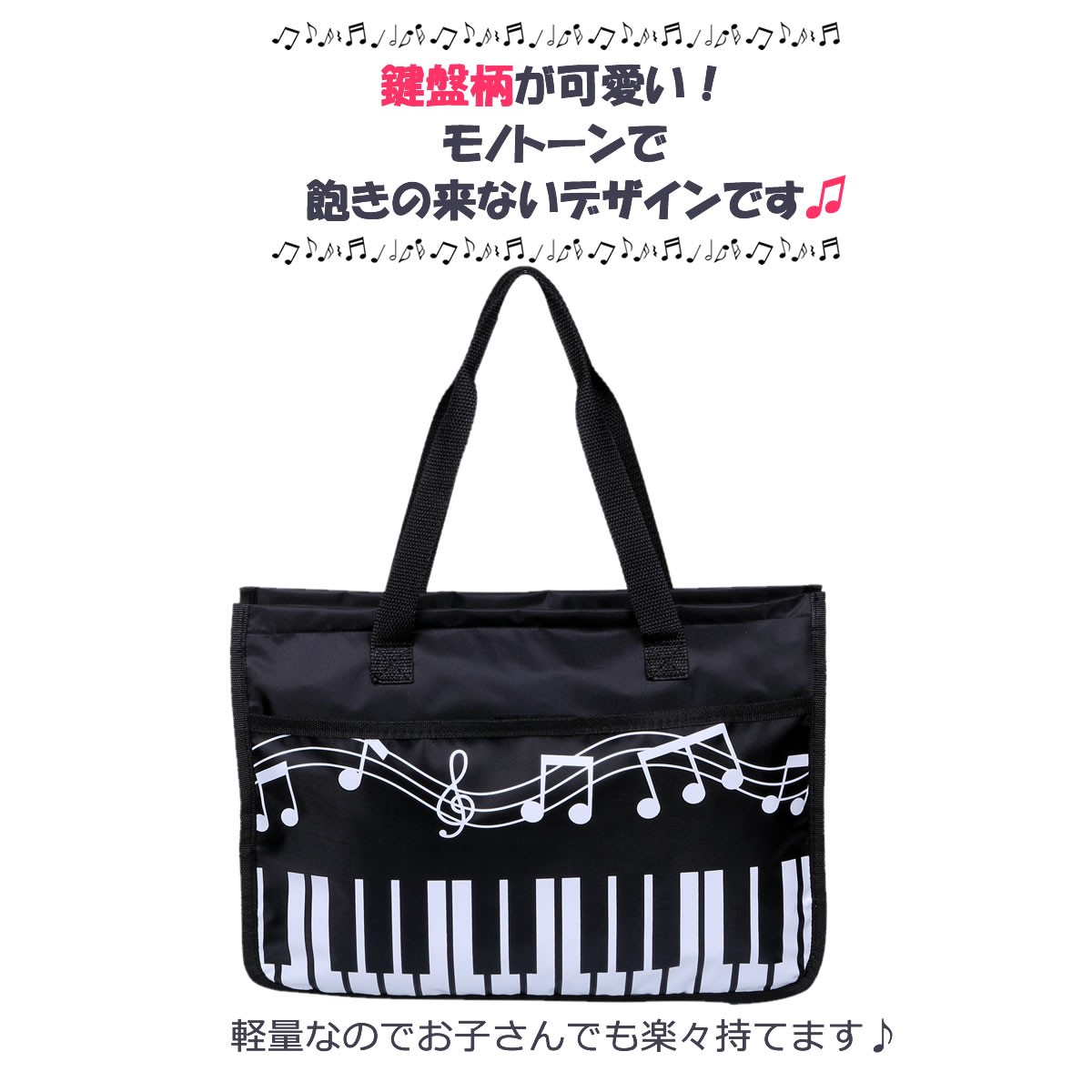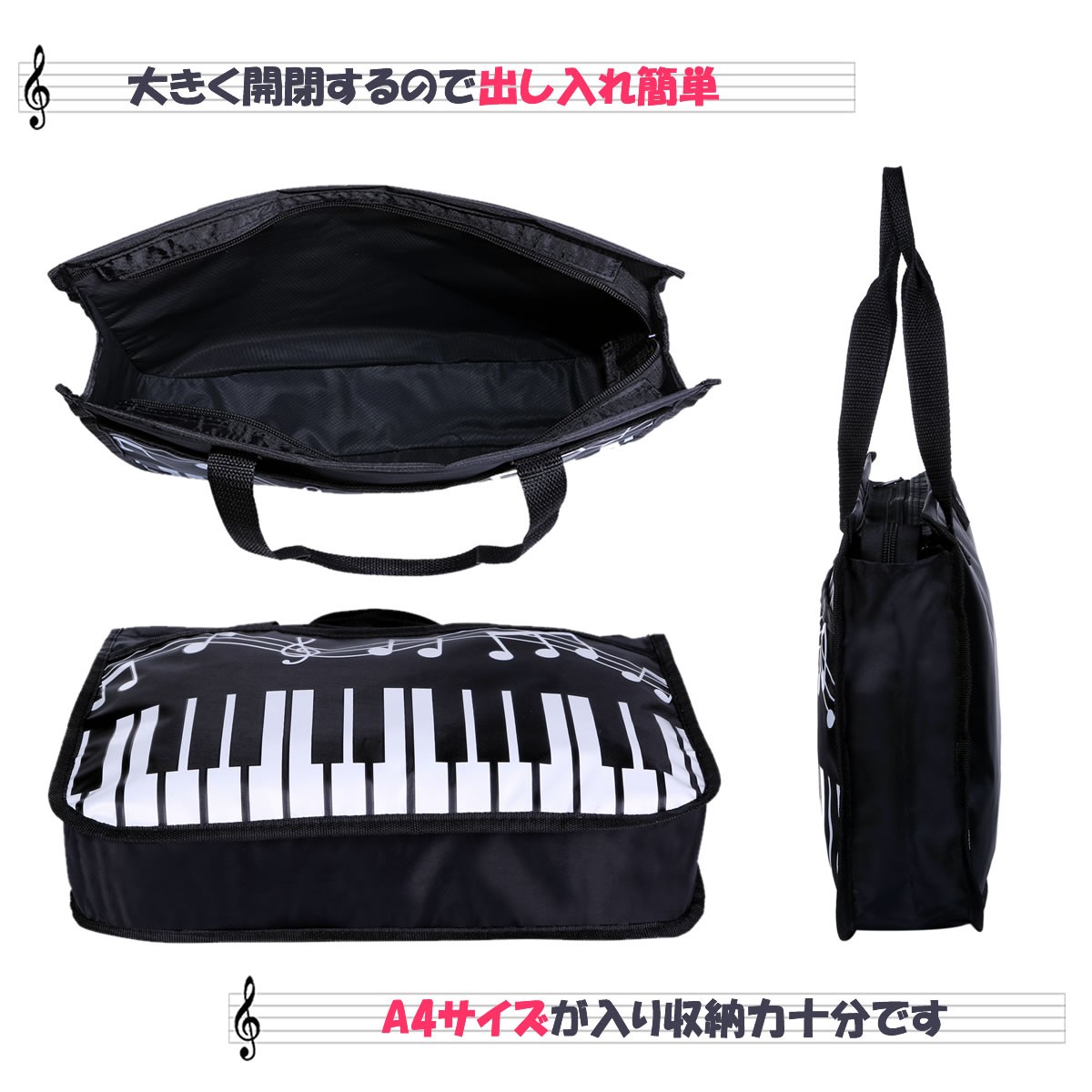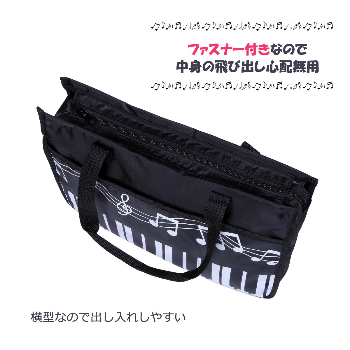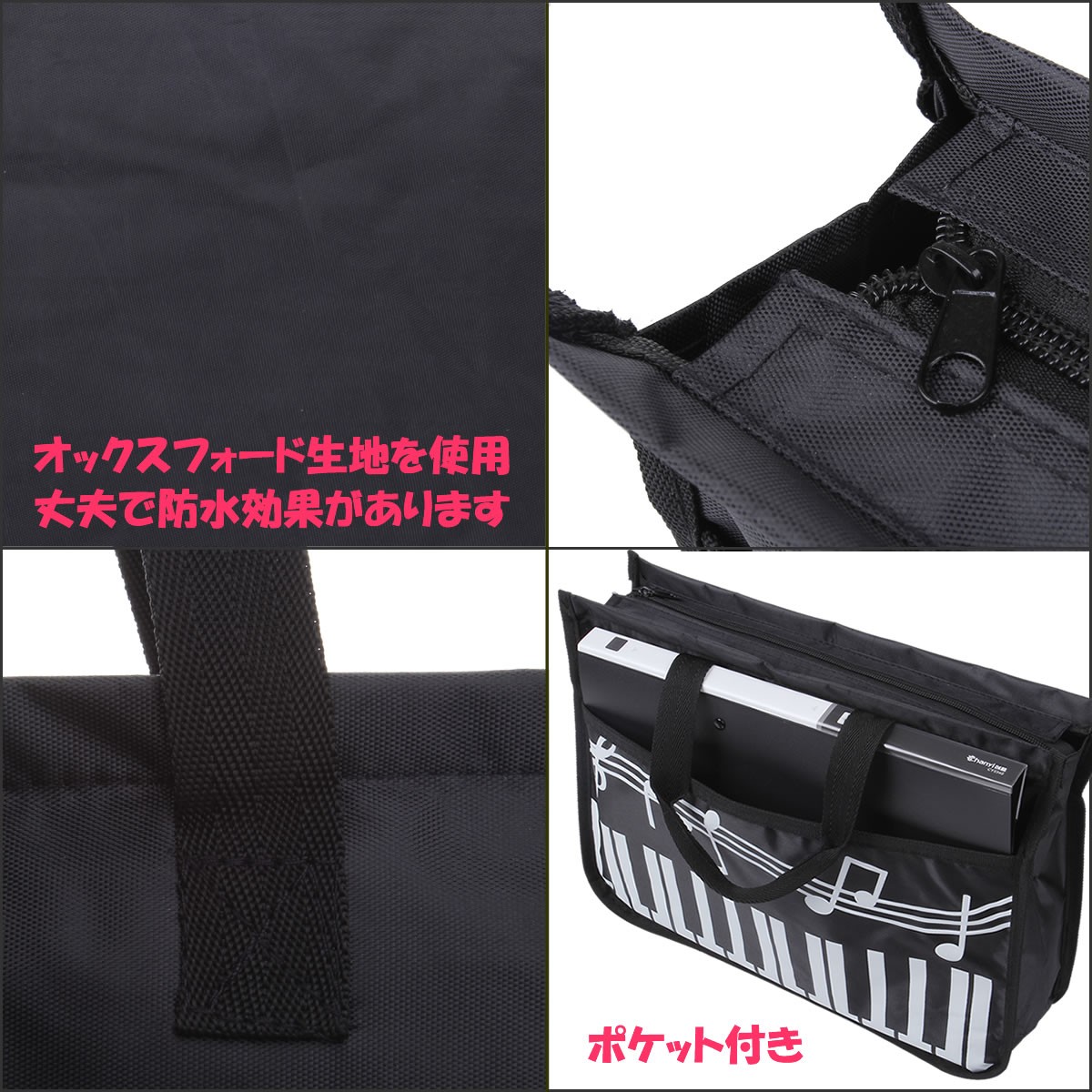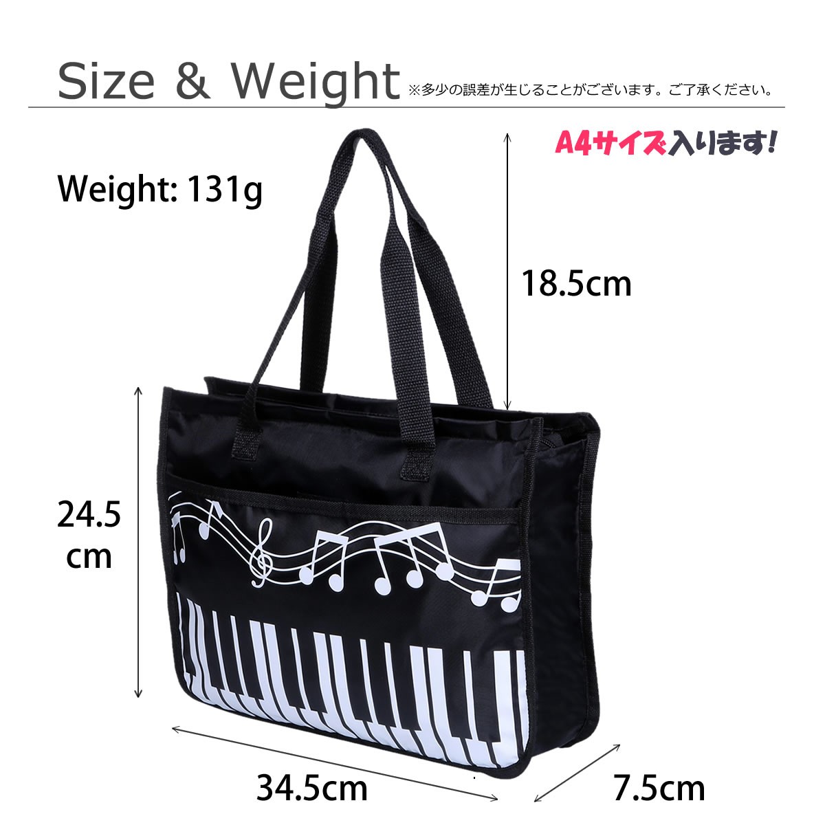 ピアノ鍵盤柄のレッスンバッグ◇横型で出し入れしやすく、ファスナー仕様なので中身の飛び出しなど心配無用◆A4サイズが入るので便利◇7.5cmのマチ付き◆前面にポケットが付いているので小物などの収納可能◇軽量なのでお子さんでも楽々持てます◆オックスフォード生地使用で丈夫で防水効果があります【サイズ】(約)横34.5cm×高さ24.5cm×マチ7.5cm【重量】(約)131g【素材】オックスフォード生地【生産地】