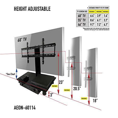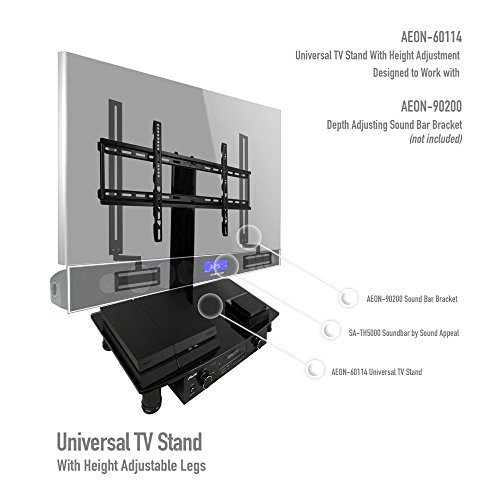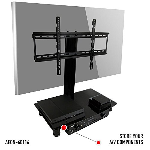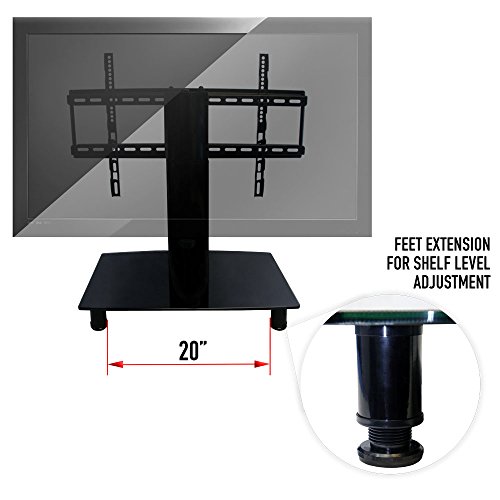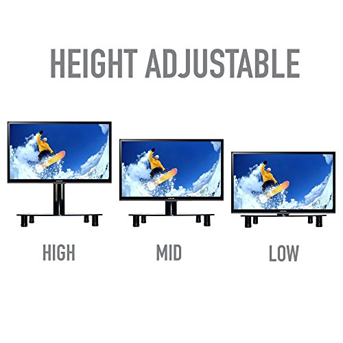 -. Feature : Universal TV stand with adjustable legs will allow for adjustable storage below your stand and also permits the stand to be leveled easily. Works great as a Samsung TV stand, Vizio TV stand, Panasonic TV stand, Sony TV stand, and many more. This adjustable TV stand offers added functionality with height and leveling adjustment to achieve the best look for your A/V equipment. The black 10mm thick tempered safety glass base offers rigid support while maintaining a great look. / Adjustable TV Stand Swivels left or right so achieving the ideal viewing angle has never been easier. Also height adjustable so your TV can be adjusted to your application or allow room for a Soundbar or component below. This way the IR sensor on your TV will never be blocked and your remote control will always function as it should. With 3" if adjustable storage below the stand most components can be easily concealed. Add a shelf to any setting! / This TV stand adds a unique ability to swivel where others cannot. Adustable up to 45 degrees in each direction allows you to utilize the best viewing area by simply pivoting the unit. No need for any tools, adjust it easily whenever you wish. This feature is usually available only on articulating TV wall mounts, conventional TV stands do not offer this feature. / This TV stand measures 27.25" inches tall (from top to bottom of legs) which is not including TV height. The base is 26.5" wide and 16" deep and will accommodate larger components like an amplifier. Maximum TV weight is 80 pounds. This unit weighs in at just 16 pounds. / Universal TV Stand will fit most TVs from 32 to 60 inches in size and weighing up to 80 pounds. To make sure this mount will fit insure your TV's VESA bolt pattern falls between these two sizes : 100x100mm up to 600x400mm. If your TV's VESA pattern falls between these two sizes then it will fit your TV. If you wish to confirm your TVs fitment or need further help, please contact AV Express.