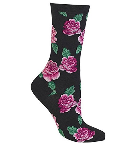 HOT SOX WOMEN'S PINK ROSE PRINT ON BLACK WOMEN'S CREW SOCK SIZE: 9-11