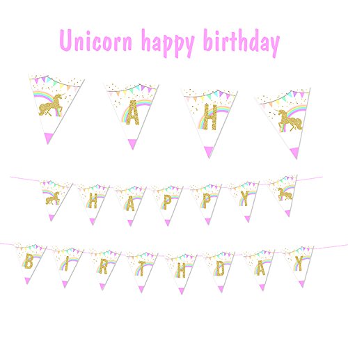 - Special Design Rainbow Unicorn Happy Birthday Party Bunting Banner Party Decorations - The beautiful shiny gold foil printed letters will definitely catch the attention of everyone when they shimmer in the light. Great birthday party decoration for any age or any occasion. Especially for kids.